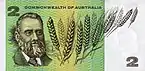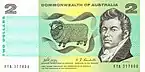 $2 | 145×72.5 | Пионер шерстяной промышленности в Австралии Джон Макартур и овца мериноса | Австралийский агроном Вильям Фаррер и ростки пшеницы | Водяной знак с изображением Джэймса Кука | 1966 | 1988 |