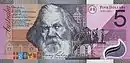$5 | 130×65 | 100 лет Австралии | В центре — портрет Сэра Генри Паркса; слева — изображение школы искусств в Тентерфилде, где Генри Паркс произнёс свою речь о необходимости создания национального парламента и федеративной Австралии; отрывок из этой речи, его подпись, а также изображения государственных эмблем; справа — сцена с картины австралийского художника Тома Робертса «Открытие первого парламента Австралийского Союза», изображение Павильона Федерации, расположенного в одном из парков Сиднея, а также Королевского выставочного центра в Мельбурне. | В центре — портрет Кэтрин Хелен Спенс, подпись Спенс, микропечать со словами австралийского гимна; слева — здание государственного детского департамента, Южный Крест; справа — уменьшенные портреты пяти исторических лиц, боровшихся за создание федерации, изображение солнечных лучей, ветка акации. | Окно в форме листка | 1 января 2001 |