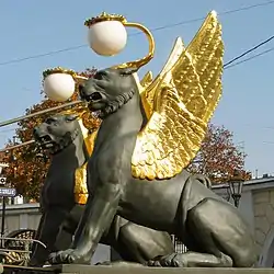 Особую известность мосту принесли угловые скульптуры крылатых львов (часто ошибочно именуемых грифонами) работы скульптора П. П. Соколова[7]. Мифические крылатые львы, изображения которых ранее встречались только в отделке мебели и архитектурных деталях, впервые были отлиты в огромных размерах и украсили улицу[1]. Работа над созданием моделей с мая по сентябрь 1825 года, также скульптором были изготовлены алебастровые формы[1]. Скульптуру предполагалось чеканить из медных листов, но затем фигуры (высотой в 2,85 м) отлили из чугуна на Александровском чугунолитейном заводе. Крылья грифонов были отчеканены из листовой меди и покрыты сусальным золотом[1][10].
