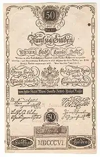 Оформление купюр постепенно менялось. На банкоцеттелях выпуска 1784 года появились водяные знаки. Билеты выпуска 1806 года, выпущенные номиналами в 5, 10, 25, 50, 100 и 500 гульденов, были двухсторонними. На обеих сторонах банкнот этого выпуска номинал, кроме немецкого (в гульденах, gulden), указывался также на других языках империи: венгерском — в форинтах (forint), чешском — в золотых (zlaty), польском — в рынских (ryński), итальянском — во флоринах (fiorino)[4]. На купюрах этого выпуска также появился новый защитный элемент — повторение изображения лицевой стороны на оборотной стороне в упрощённой форме в зеркальном отражении. При рассмотрении купюр на свет оба изображения совмещаются с точностью до 0,3 мм.