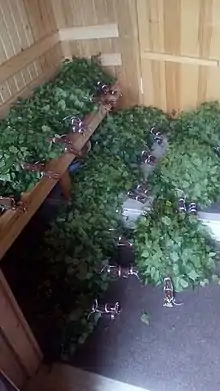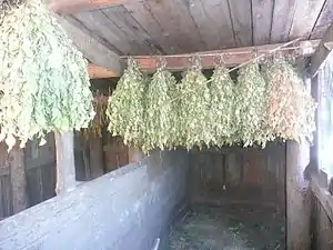 Хорошо хранить веники в стоге сена. Можно заготовленные ветки хранить в темноте зимой и в виде одного снопа, по мере надобности связывая их в веник. В обоих случаях листья сохраняются лучше.