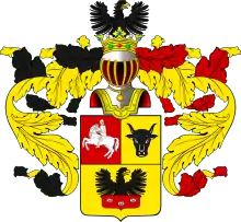 Щит увенчан обыкновенным дворянским Шлемом, с дворянскою на нём Короною, на поверхности которой означен описанной в щите Орёл. Намёт на щите золотой, подложенный чёрным и красным.