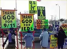 В отношении войны в Ираке, была листовка WBc с надписью: «Америка бомбила нашу церковь СВУ, изготовленным студентами-гомиками… Теперь Бог, в его карающем гневе, убивает американцев мусульманскими СВУ: „Не прикасайтеся к помазанным Моим, и пророкам Моим не делайте зла“ (1Пар. 16:22)»[128].