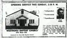 Баптистская церковь Вестборо (англ. Westboro Baptist Church, сокр. WBC) — американская религиозная организация, известная своими враждебными публичными выступлениями против различных групп населения, особенно против гомосексуальных и трансгендерных людей, а также резкой критикой других религий, в том числе католицизма, православия, ислама, иудаизма. Община также критикует американских политиков и военных[2][3]. Это широко известная группа ненависти[4], находящаяся под наблюдением «Антидиффамационной лиги» и Southern Poverty Law Center. Эта церковь участвовала в акциях против гомосексуалов как минимум с 1991 года, когда её члены попытались с применением силы прекратить мероприятие сторонников однополых отношений, проходившее в шести кварталах к северо-западу от здания этой церкви, в Гейдж-парке (англ. Gage Park)[5]. В дальнейшем Баптистская церковь Вестборо устраивала антигомосексуальные протесты на похоронах военных и известных людей, и на других публичных мероприятиях[6]. Другие протестные акции были направлены против евреев и католиков; на некоторых члены WBC топтали флаг США или вывешивали его перевёрнутым, скандировали лозунги вроде «слава Богу, солдаты мертвы» (англ. thank God for dead soldiers), «Бог взорвал войска» (God blew up the troops), «благодарим Бога за 11 сентября» (thank God for 9/11) и «Бог ненавидит Америку» (God hates America)[7]. Баптистскую церковь Вестборо несколько раз обвиняли в «промывании мозгов»[8][9][10] и критиковали за схожесть с тоталитарными сектами[11][12][13].