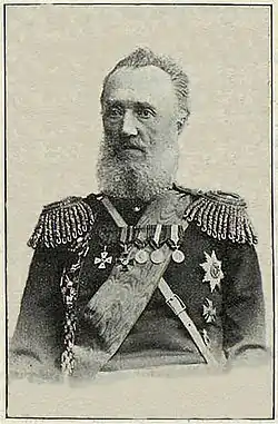 | Награды и премии | Орден Святого Станислава 3-й ст. (1862), Орден Святого Георгия 4-й ст. (1862), Золотое оружие «За храбрость» (1864), Орден Святой Анны 3-й ст. (1866), Орден Святого Станислава 2-й ст. (1866), Орден Святой Анны 2-й ст. (1869), Орден Святого Владимира 4-й ст. (1873), Орден Святого Владимира 3-й ст. (1877), Орден Святого Станислава 1-й ст. (1881), Орден Святой Анны 1-й ст. (1884), Орден Святого Владимира 2-й ст. (1890), Орден Белого Орла (1896), Орден Святого Александра Невского (1905). |