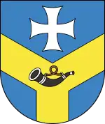 Герб: В голубом поле испанского щита золотой вилообразный крест, в центре которого размещён охотничий рожок натурального цвета, сверху — серебряный кавалерский крест.