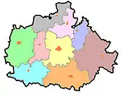 | Район | Оригинальное название | Адм. центр | Площадь (км²) | Жителей | Посёлков | Цвет | Карта |