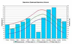 Климат Барселоны — субтропический. Самыми холодными месяцами являются январь и февраль (средняя температура около +10 °C), самыми жаркими — июль и август (средняя температура около +25 °C). Наибольшее количество осадков выпадает в октябре (около 90 мм); наименьшее — в июле (около 20 мм).