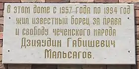 В 1998 году на фасаде дома была установлена мемориальная доска в честь Дзияудина Мальсагова, который проживал здесь в 1957—1994 годах. В годы второй чеченской войны она была уничтожена. Усилиями вдовы Мальсагова 7 августа 2012 года мемориальная доска была установлена вновь. Новую доску сделал сын мастера, сделавшего первую мемориальную доску[5].