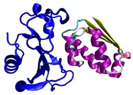 ![]() Комплекс, состоящий из барназы (слева) и её ингибитора барстара (справа). Барстар раскрашен в соответствии со своей вторичной структурой. | |