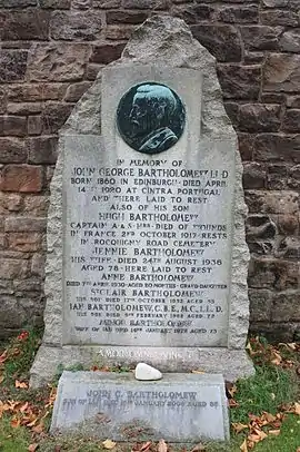 Мемориал Бартоломью, созданный Пилкингтоном Джексоном, существует на северной стене расширения 20-го века кладбища Дина в Эдинбурге. У памятника похоронены его жена Дженни, сыновья Хью и Ян Бартоломью и внук Джон Кристофер Бартоломью. Его дочь Маргарет вышла замуж за Филипа Фрэнсиса Гамильтона-Грирсона, внука сэра Филиппа Джеймса Гамильтон-Грирсона.