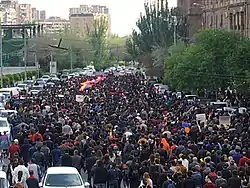 - 21 апреля — протесты и столкновения с полицией продолжились[26]. Демонстранты начали шествие с окраины столицы, района Нор-Норк, и дошли до центральной площади Республики. Вечером на площади Республики состоялся митинг. Весь день протестующие блокировали улицы в Ереване, а вечером все снова собрались на митинг на площади Республики. Всего за день полицией были задержаны более 100 человек, в том числе один из лидеров движения Армен Григорян. Ему грозит уголовная ответственность за организацию массовых беспорядков[27]. Кроме того, Служба Национальной безопасности Армении сообщила о задержании шести человек якобы по подозрению в подготовке взрывов и оказания давления на государственные органы, для того, чтобы добиться выполнения ими конкретных требований[28]. Около 19 часов вечера (по Ереванскому времени) президент Армении Армен Саркисян прибыл на площадь Республики, где встретился с лидером протестов Николом Пашиняном[29]. В то же время премьер-министр страны Серж Саргсян заявил, что готов уйти в отставку после урегулирования проблемы Карабаха. По словам Саргсяна, он занял пост премьер-министра из-за сложной геополитической обстановки в регионе[30]. Позднее было сообщено, что Президент встретился с премьером.