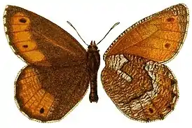 Длина переднего крыла 25—32 мм. Основой фон крыльев тёмно-коричневый. На верхней стороне крыльев имеются крупные охристо-коричневые пятна с размытой внутренней границей, внутри которых на передних крыльях располагается по 3-4 чёрных глазка. На передних крыльях самца отсутствуют андрокониальные поля.