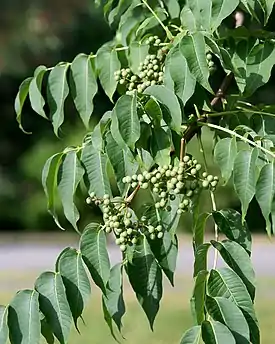 Дерево около 20 м высотой с диаметром ствола до 80 см. Кора продольно-бороздчатая, серая, пробковый слой даже у взрослых деревьев как правило не толще 10 мм. Луб жёлтый. Почки длиной около 2мм, ширококонусовидные. Катафиллы цельные, яйцевидные, быстро опадающие. Листья с характерным запахом, листовая пластинка с 2—5 парами боковых листочков; листочки 7—10 см длины и 3—5 см ширины, яйцевидные или яйцевидно-ланцетные, на верхушке заострённые, в основании закруглённые, в верхней половине по краю городчато-пильчатые, без ресничек (или реснички малозаметные), сверху — тёмно-зелёные, снизу — сизовато-зелёные, с обеих сторон очень слабо мелковолосистые или вовсе голые; ось листа и черешки мелковолосистые. Соцветие метельчатое, безлистное. Венчик желтовато-зелёный; лепестки 3—4,5 мм длины, чашелистник около 1 мм длины. Костянки 5-семянные, около 10 мм в диаметре, шаровидные, черные[2]. Цветёт в июне, плоды созревают в сентябре[3].