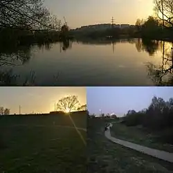 По часовой стрелке, начиная сверху: вид на Пенягинский пруд; вид на пойму реки в её верхнем течении; земляная плотина, перекрывающая русло реки в среднем течении | |
