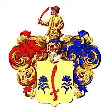 В золотом щите червлёный вогнутый меч остриём вверх, между двух лазоревых васильков.