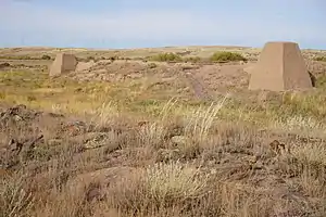 Караульная башня Карауылтас высотой 3,5 м расположена в 2 км от города. Система оросительных каналов брала начало в реке Сарыбулак и снабжала весь город водой. Входящая в состав архитектурного памятника пещера-шахта расположена в 1,3 км от города имеет глубину 20 метров, стены шахты выложенными жженым кирпичом, а пол вымощен камнем.