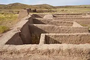 Останки городища имеет форму окружности. В центре расположена трапециевидной формы цитадель (26,23 м). И цитадель и город окружен рвом и высокой грядой грунта из этого рва. Ширина внешней гряды 5-7 метров, высота 1,4 м, ширина рва вокруг цитадели 12 м, высота 2,3 м. Во внутреннем северном углу имеется хранилище (яма) для пресной воды, где хранилась питьевая вода. Вода в хранилище поступала по арычной системе.