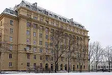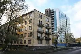 Квартал, примыкающий к дому со шпилем, появился также в послевоенные годы. В доме 47 с 1962 по 1975 год жил артист Ефим Копелян, с 1971 по 1990 год — артист Владислав Стржельчик, с 1991 по 1994 год — альпинист Владимир Балыбердин. На доме установлены мемориальные доски.