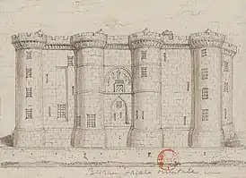 - Проект будущей королевской площади, на котором видны очертания Бастильской крепости, которую подразумевалось снести