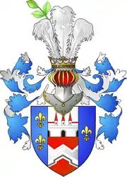 В поле лазоревом три лилии, расположенные треугольником; посередине столп, пересеченный пополам; в верхнем его, серебряном поле ворота с тремя башнями, а в нижнем, красном, бастион. В навершии шлема три страусовые пера, с зеленою между двух первых веткою.