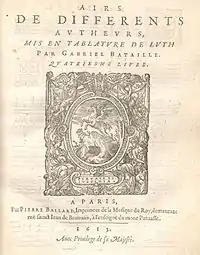 Титульный лист книги Габриэля Батая «IVe livre d’airs mis en tabulature de luth» (1613)