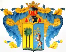 Щит разделен перпендикулярно на две части, из коих в правой части, в золотом поле, поставлены два пальмовых дерева. В левом голубом поле стоящий на траве лев с загнутым хвостом держит в правой передней лапе золотую ветвь.
