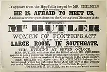 В 1869 году Батлер стало известно об Актах об инфекционных заболеваниях. Акты представляли собой законы, введённые в 1864, 1866 и 1869 годах для контроля проституции в попытке сдерживать распространение венерических заболеваний, особенно в Британской армии и Королевском флоте[54]. Акты давали полномочия полиции задерживать в определённых местах женщин, которые подозревались в проституции[lower-alpha 8][lower-alpha 9], при этом никаких доказательств, кроме слов полицейского, не требовалось. Если судья давал согласие, женщинам проводилось обследование гениталий. Если женщины страдали венерическими заболеваниями, их содержали в закрытой больнице до тех пор, пока они не излечивались. Если они отказывались пройти обследование или госпитализироваться, их могли посадить в тюрьму, часто с принудительными работами[55][57].