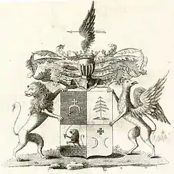 Щит увенчан обыкновенным дворянским Шлемом с дворянскою на нём Короною, на поверхности которой распростёрто чёрное Крыло, пронзенное серебряною Стрелою, летящею в правую сторону. Намёт на щите голубой и золотой подложенный серебром и красным цветом. Щитодержатели: с правой стороны Лев, а с левой — Гриф[3].