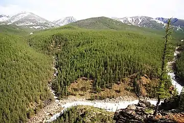 Территория района характеризуется горно-таёжным ландшафтом и покрыта древесной растительностью, среди которой господствующее положение занимает лиственница. На южных склонах и в долинах встречается берёза, осина, ива, ёрник. На крутых склонах гор лес разрежен, и начиная с абсолютных отметок около 1300—1500 м лес сменяется кедровым стлаником, а преимущественно с высоты 1500 м начинаются гольцы с курумами, часто покрытыми лишайником.