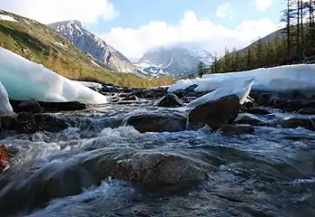 Климатические особенности района обусловливаются повсеместным развитием многолетней мерзлоты, нижняя граница которой находится на глубине 100—250 м. Глубина деятельного слоя достигает 2 м, в зависимости от экспозиции склонов, растительного покрова и состава грунта она изменяется в широких пределах — на открытых участках и южных склонах грунт протаивает до коренных пород, а на северных склонах и в долинах, покрытых мощным почвенно-растительным покровом и кустарниковой растительностью — лишь до 0.5—1 м.