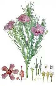 Ботанические иллюстрации работы Ф. Бауэра из книги «Illustrationes Florae Novae Hollandiae»: Гревиллея Бенкса (Grevillea banksii), Банксия ярко-красная (Banksia coccinea) Alyogyne hakeifolia Stylidium violaceum. | ||||||||||
