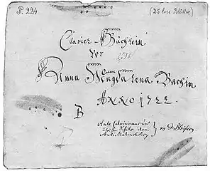 Обложка первого «Альбома Анны Магдалены Бах» 1722 года с посвятительной надписью Иоганна Себастьяна Баха.