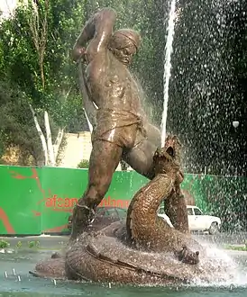 Тонкий и умелый подход к декоративной скульптуре, рассчитанный на природное окружение, можно наблюдать в декоративном фонтане с символической фигурой Бахрам-Гура. Это, кстати, первый в Азербайджане скульптурный памятник литературному герою одной из поэм Низами Гянджеви.