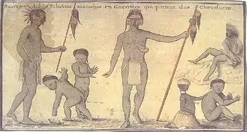 Представители различных индейских племён. Крайний справа - индеец из племени атакапа. А. де Бац, 1735.