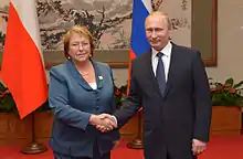 11 марта президент РФ Владимир Путин поздравил Бачелет с вступлением в должность президента. В поздравительном послании Путин отметил дружественный, конструктивный характер отношений, сложившихся между Россией и Чили, позитивную динамику сотрудничества на различных направлениях, подтвердил готовность к дальнейшему расширению политического диалога как на двусторонней основе, так и в различных международных структурах, прежде всего, в рамках ООН и в АТЭС, что будет способствовать решению многих актуальных вопросов региональной и глобальной повестки дня. В сообщении также говорится, что "кроме того, президент России выразил надежду на активное развитие российско-чилийских торгово-экономических связей, реализацию взаимовыгодных проектов в энергетической, нефтегазовой, горнодобывающей, авиапромышленной и других областях[23].