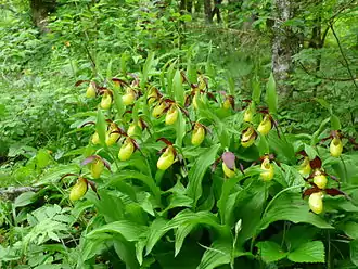 5 видов: Cyp. calceolus, Cyp. shanxiense (sect. Cypripedium subsect. Cypripedium), Cyp. macranthon (sect. Cypripedium subsect. Macrantha), Cyp. guttatum, Cyp. yatabeanum (sect. Bifolia).