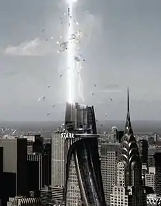 - Башня появляется в фильме «Мстители». Новая башня питается от независимого дугового ядерного реактора, способного обеспечить башню энергией на целый год без всяких издержек для города[14]. Именно поэтому Локи выбирает башню, как место для использования Тессаракта, чтобы открыть портал для инопланетного вторжения. После битвы между силами Локи и Мстителями разрушаются верхние уровни башни, остаётся единственная буква А от надписи «STARK» — первая буква слова «Avengers» (в этом своеобразный символизм).