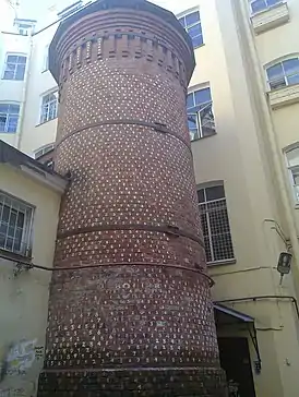 Необычный вид и архитектурная изысканность этой дымовой трубы делают её похожей на башню замка, как будто спрятанную от посторонних глаз внутри двора-колодца, что в сочетании с неординарностью личности самого аптекаря Вильгельма Пеля породило вокруг неё немало легенд романтического и мистического свойства[4]. По наиболее распространённой версии, башня была создана при перестройке Пелем своей аптеки во второй половине XIX века. В аптеке располагались мастерские по изготовлению лекарств и доходный дом, а «башня» являлась трубой-вытяжкой химической лаборатории[4]. Частым гостем Пеля был химик Дмитрий Менделеев[1]. Примерная высота башни — 11 метров, диаметр — около 2 метров.