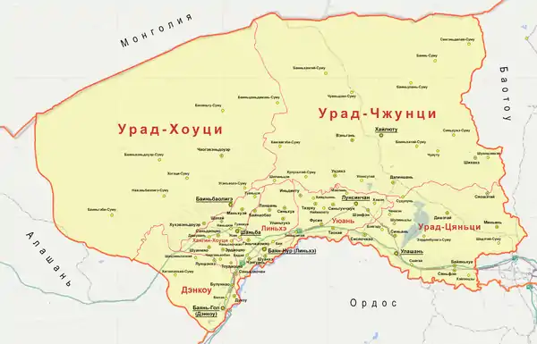 | 6 | Хошун | Урад-Хоуци | 乌拉特后旗 | Wūlātè Hòu qí | 60 000 | 24 925 | 2 |