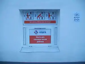 - Россия — федерального закона, регулирующего установку и эксплуатацию беби-боксов, не существует.[4] Вместе с тем многие профильные структуры и организации устанавливают беби-боксы на своей территории. С 2011 года беби-боксы установлены при медучреждениях и религиозных организациях в Краснодарском, Пермском, Камчатском, Ставропольском краях, Владимирской, Калининградской, Курской, Ленинградской, Московской, Псковской, Свердловской областях, Татарстане.[4]