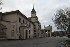 В 1950—1955-х годах здание ипподрома было реконструировано и перестроено архитекторами И. В. Жолтовским (руководитель), П. И. Скоканом и В. Л. Воскресенским в стиле сталинской и палладианской архитектуры. На фасаде появился один из самых больших в Москве портиков, а также изящная башенка. От старого здания остались только фасадные стены. Одну из квадриг в целости и сохранности поместили над серединой портика, а коней другой квадриги разместили на краях того же портика и по бокам башенки[1]. Башня замыкает перспективу 2-го Боткинского проезда.