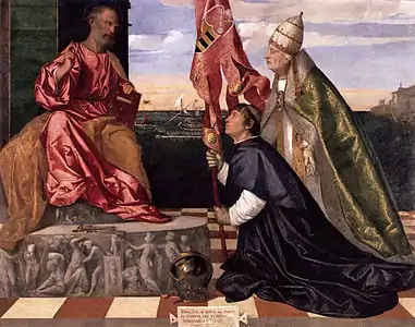 - KMSKA. — Titiaan. Jacopo Pesaro, bisschop van Paphos, door paus Alexander VI Borgia voorgesteld aan de heilige Petrus.