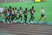 Спортсмены в беге на 5000 метров начинают с высокого старта и общей стартовой позиции.