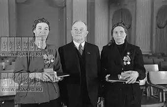 ![]() О.В. Куусинен и Герои Социалистического Труда бригадиры полеводческих бригад подсобного хозйства им.Куйбышева при Кузнецком металлургическом комбинате Н.П.Бедарева (слева) и К.Н. Пономарева (справа) после вручения наград | |