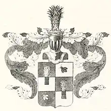 Щит разделен на шесть частей, из них в первой и четвёртой в зелёном, в третьей и шестой в золотом полях изображено по одному хлебному снопу; во второй в золотом и пятой части в зелёном полях две пчелы, которые, как и снопы, вид свой имеют переменных с полями цветов.