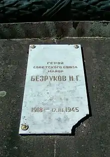 С воинскими почестями останки майора Н. Г. Безрукова похоронили во Львове на Холме Славы, где покоится прах 26 Героев Советского Союза.