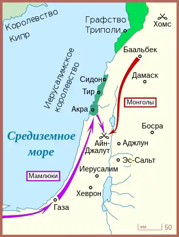 Однако Хулагу с основной частью армии, узнав о смерти великого хана Монгольской империи Мункэ, вынужден был отступить на восток, и в Палестине остался лишь сравнительно немногочисленный корпус под командованием Кит-Буги. Кутуз, по инициативе Бейбарса, казнил монгольских послов, в результате чего война стала неизбежной. Вскоре Кутуз и Бейбарс выступили из Каира, пересекли Иерусалимское королевство и разбили лагерь рядом со столицей крестоносцев Акрой, где три дня отдыхали и пополняли припасы. Бейбарс хотел захватить Акру, но Кутуз отказался нападать на союзника.