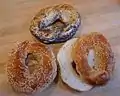 Бейглы бывают обычные и яичные, из цельной муки и пумперникели, с корицей и изюмом, посыпанные маком, кунжутом, чесноком, и луком, крупной солью, а также — со всем вместе.