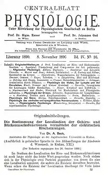 - Die Bestimmung der Lokalisation der Gehirn- und Rückenmarksfunktionen vermittelst der elektrischen Erscheinungen. Zentralblatt Physiol s. 473—476 (1890)
